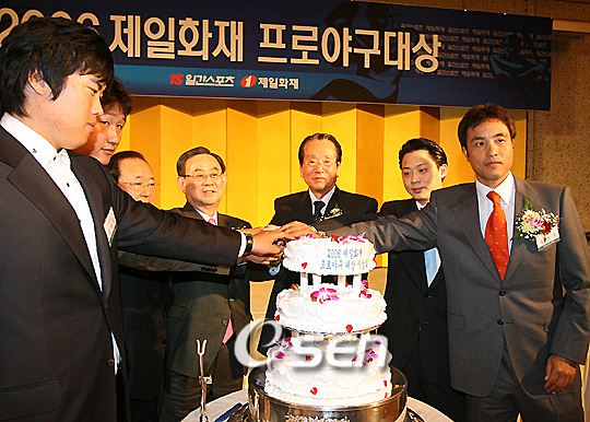 13일 일간스포츠가 주최하고 제일화재가 후원하는 '2006 제일화재 프로야구대상' 시상식이 프라자 호텔에서 열렸다. 대상을 받은 롯데 이대호와 최고투수상을 받은 한화 류현진, 특별상의 송진우 등 수상자들과 신상우 한국야구위원회 총재, 이내흔 대한야구협회장, 장중호 일간스포츠 사장 등이 케이크 커팅을 하고 있다./손용호 기자spjj@osen.co.kr