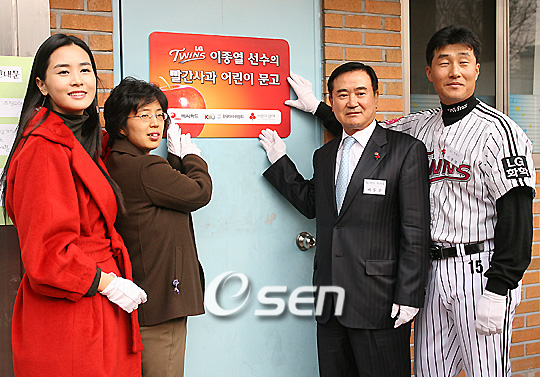 13일 서울 미아동 반도공부방에서 올 시즌 잠실야구장에 설치된 비씨 홈런존에 홈런을 친 선수들과 비씨 카드 모델 이다해가 참석한 가운데 각 구단 명의로 된 약 2억 5000만 원 상당의 문고를 기증하는 행사가 벌어졌다. 이다해, 이은미 교사, 배동찬 비씨카드 부회장, LG 이종렬이 '비씨카드 빨간사과 어린이문고' 현판식을 가지고 있다./손용호 기자spjj@osen.co.kr