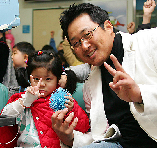 LG 트윈스의 조인성 박용택 봉중근 등이 LG전자㈜와 공동으로 2006시즌 LG 선수들의 기록 달성과 시즌 중 적립했던 'LG 수호천사 사랑의 기금' 을 지난 15일 서울대 어린이병원의 난치병 환우들에게 전달했다. 적립금은 조인성의 도루저지(22개), 박용택의 도루(25개), 이승호의 승수(8승), 이병규의 안타(142개) 숫자에 따라 적립한 금액에 LG전자㈜의 후원금을 합해 총 1556만 원을 전달했다. 후원금을 전달한 뒤 선수들은 직접 병실을 방문, 사인공을 나누어 주기도 했다. 조인성이 한 어린이와 함께 기념사진을 찍고 있다./LG 트윈스 제공.