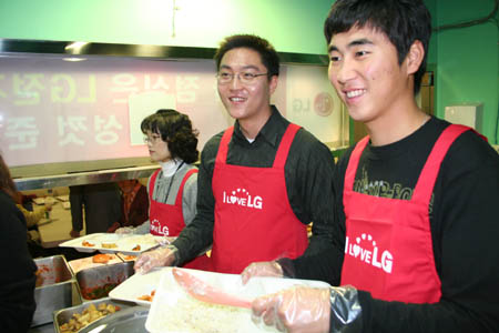 마무리 투수 원년을 이웃 사랑으로 마무리한다. 올 시즌 마무리 투수로 자리를 잡은 LG 트윈스 우완 투수 우규민(21)이 20일 LG전자 직원 100여 명과 함께 서울 마포구 공덕동 사랑의 전화복지재단 구내식당에서 500여 명의 독거 노인 등을 대상으로 ‘밥퍼’봉사활동(무료급식 봉사활동)에 참여했다. 이날 우규민은 배추-마늘 등 반찬 재료를 다듬는 일부터 반찬 만들기, 배식, 설거지, 청소 등 뒷정리까지 일일 무료급식 활동의 전 과정에 참여해 구슬땀을 흘렸다. 우규민은 “그동안 가볍게 생각해 왔던 밥 한 끼가 굉장히 소중하다는 것을 느꼈다”며 “앞으로도 기회될 때 마다 어려운 분들을 돕고싶다”고 말했다. 올 시즌 LG의 마무리투수로 활약했던 우규민은 62경기에 등판해 3승 4패 17세이브 방어율 1.55를 기록했다. sun@osen.co.kr 우규민(오른쪽)이 구단 홍보팀의 양승혁 대리와 함께 독거 노인 등을 대상으로 '밥퍼 봉사활동'을 벌이고 있다. /LG 트윈스 제공