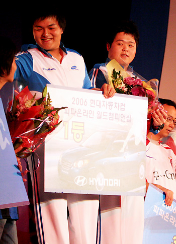 전경운-박윤서 조가 찰떡 호흡을 과시하며 다시 한 번 피파온라인 최강자의 자리를 지켰다. 전경운-박윤서 조는 21일 잠실 롯데월드 가드 스테이지 특설무대에서 열린 2006 현대자동차컵 피파온라인 월드챔피언십 결승전서 1승 1무의 성적으로 우승컵을 품에 안았다. 또 다시 챔피언의 자리에 오르자 전경운은 "어렵게 우승을 해서 기쁘고 박윤서 선배가 잘 이끌어줬다"고 우승한 소감을 밝혔다. 파트너 박윤서는 "이번에는 정말 어렵게 우승했다 연습하면서 호흡의 문제도 있었고 연습도 쉽지 않았다. 전경운 선수의 고생이 많았다"고 말했다. 그동안 방송대회 약하다는 평을 들었던 박윤서는 "아마 우승할 실력이 아니었던 것 같다"며 "이제는 안 질거라는 자신감이 들었다. 곧 또 다른 리그가 시작되는데 팀플에서는 안 질 자신이 있다"고 힘주어 말했다. 제일 기억에 남는 경기를 묻는 질문에 전경운은 "제일 기억에 남는 경기는 결승전"이라며 "가장 힘들었던 경기는 8강전이었다. 단판이라서 긴장을 많이했고 힘들게 이긴 기억이 난다"고 말했다. 파트너인 박윤서는 "4강전 경기에서 우리의 슈퍼파이트 진출을 막았던 황상우 조에게 빚을 갚은게 기억에 남는다"고 말했다. 피파 온라인 최강자로 다시 한 번 자리매김에 성공한 전경운-박윤서 조는 2007년 목표를 이구동성으로 "최고의 자리를 지키겠다"는 뜻을 밝혔다. 전경운은 "피파온라인이 나오면서 우승을 안 한 대회가 없다. 뜻깊은 한해를 보냈다. 내년에는 더 열심히 해서 나 전경운이라는 이름 석자를 알리고 싶다"고 포부를 밝혔고 박윤서는 "올해 정말 최고의 한 해를 보냈다. 내년에는 올해보다 더 열심히 해서 정상의 자리를 지켜나가겠다"고 포부를 밝혔다. scrapper@osen.co.kr MBC게임 제공.