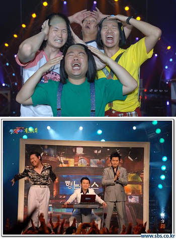 개그 배틀은 아니다. 굳이 이름을 붙이자면 ‘입심 겨루기’ 정도가 될까. 공개 코미디 프로그램의 양대 산맥이라 할 수 있는 KBS 2TV ‘개그콘서트’ 팀과 SBS TV ‘웃음을 찾는 사람들’ 팀이 안방에서 한 자리에 모였다. 12월 25일 크리스마스의 깊은 밤에 방송될 SBS TV ‘야심만만’이 그 무대이다. 경쟁 방송사의 간판 개그팀들이라 좀처럼 방송에서는 한 자리에 모이기 어려운 이들이지만 때가 때인지라 ‘야심만만’에 집결해 입심대결을 펼치기로 했다. 물론 이들은 ‘장외’에서는 교류가 잦다. ‘웃찾사 vs 개그콘서트 개그배틀’이라는 공연명으로 한 팀을 이뤄 전국 15개 주요도시를 돌며 관객들을 찾고 있기도 하다. 지난 9일부터 시작된 이 공연 수익금은 불우이웃돕기에 쓰인다고 해 훈훈한 소식이 되고 있다. 이쯤되면 TV 토크 프로그램이라고 한 자리에 모이지 말란 법이 없다. 두 개그팀이 어우러져 각자의 개성으로 시청자들에게 즐거움을 줄 수 있는 자리다. 또한 두 팀간의 불꽃 튀는 자존심 대결도 기대가 된다. ‘웃찾사’ 팀에서는 정찬우 강성범 김재우 박보드레가 대표주자로 나섰고 ‘개콘’ 팀에서는 정종철 이수근 유세윤 장동민이 뛰어들었다. 이들은 개그맨 특유의 솔직함으로 아예 대놓고 겨루기도 펼쳤다는 소식이다. ‘유행어 배틀’을 열었는데 ‘웃찾사’에서는 “생뚱맞죠~”, “뉴스가~ 뉴스다워야~ 뉴스지~”, “콩팥 춤” 등으로 공격을 하고 ‘개콘’에서는 “마빡이” “고음불가” “내 밑으로 다 조용히 햇!” 등의 유행어로 맞불을 놓았다고 한다. 양대 개그팀이 자존심 대결을 펼치는데 개그맨 기질이 다분한 MC 강호동도 가만있을 수 없었던 모양이다. 강호동이 ‘호빡이’, 정찬우가 ‘소빡이’로 변신해 호흡을 맞추는가 하면 윤종신과 이수근이 팀을 이뤄 ‘고음불가’ 공연을 펼쳐 보이기도 한다. 또한 포복절도할 웃음 뒤에 숨겨진 말 못할 아픔을 공개하는 시간도 갖는다. 크리스마스의 밤을 웃음과 감동으로 지샐 수 있을 듯 하다. 100c@osen.co.kr ‘개그콘서트’의 ‘마빡이’와, ‘웃음을 찾는 사람들’의 ‘형님뉴스’.