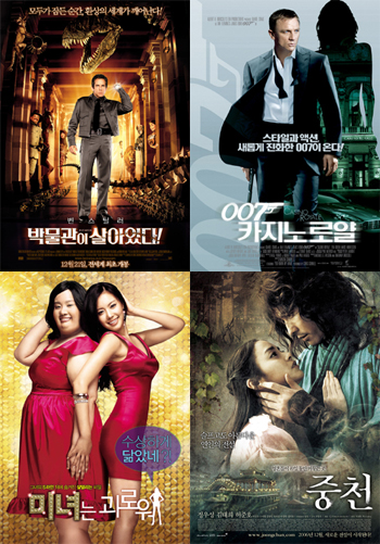 2006년 한해를 마무리하는 극장가에서 외화의 득세가 조심스레 점쳐지고 있다. 11월 극심한 침체기를 거쳐 크리스마스 시즌을 비롯한 성수기가 도래했다. 이런 가운데 좀처럼 국내 박스오피스를 내주지 않았던 한국영화들이 외화의 공세에 주춤거리고 있는 것으로 조사됐다. 영화진흥위원회 영화관입장권통합전산망에 따르면 ‘박물관이 살아있다!’ ‘007 카지노 로얄’ ‘로맨틱 홀리데이’ 등 외화들이 ‘미녀는 괴로워’ ‘중천’ ‘올드미스 다이어리-극장판’ 등 국내영화들과 치열한 경쟁을 벌이고 있는 형국이다. 먼저 12월 21일 개봉한 벤 스틸러 주연의 ‘박물관이 살아있다!’는 개봉 첫 날 7만 8000여명의 관객들 동원했다. 이어 22일에는 11만여명을 동원하며 상승세를 타고 있다. 반면 같은날 개봉한 한국영화 ‘중천’은 개봉 첫날 9만 2000여명으로 출발했지만 이튿날에는 8만 9000여명으로 감소했다. 특히 점유율로 따지면 이같은 추세는 더욱 두드러진다. 한 주 앞서 개봉한 김아중 주진모 주연의 ‘미녀는 괴로워’가 여전히 상위권에 랭크돼 외화에 맞서 선전하고 있다. 하지만 정우성 김태희 주연의 ‘중천’이 기대보다 낮은 흥행을 보이고 있고, 시사회에서 호평이 쏟아진 ‘올드미스 다이어리-극장판’이 생각만큼 큰 흥행성과를 보이지 못했다. 대신 ‘박물관이 살아있다!’와 함께 전세계적으로 흥행돌풍을 일으킨 ‘007 카지노 로얄’과 12월 14일 개봉한 ‘로맨틱 홀리데이’가 상위권에 랭크돼 국내 영화와 각축전을 펼치고 있는 상황이다. 크리스마스인 25일까지 지켜봐야 정확한 윤곽이 드러나겠지만 지금과 같은 추세라면 연말 극장가를 외화가 점령할 가능성이 크다. pharos@osen.co.kr