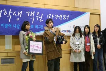 삼성 라이온즈 대학생 객원마케터(팀장 강혁준)들이 2년 연속 글로벌 프런티어상을 수상했다. 2005년부터 한국야구위원회와 잡코리아의 주관 아래 실시되고 있는 대학생 객원마케터 제도는 치열한 경쟁 끝에 선발된 대학생들이 자신들이 좋아하는 각 구단을 대표하여 각종 마케팅 아이디어와 다양한 행사 참여 등을 하는 것이다. 이 제도는 한국 프로야구 민간홍보대사로서 프로야구 이미지를 상승시키는 데 크게 기여한 것으로 평가 받고 있다. 10명으로 구성된 삼성 라이온즈의 객원마케터들은 올 시즌 활발한 활동으로 전원이 수료함은 물론 개인활동 우수상(계명대학교 김수진), 베스트 아이디어상(경북대학교 이현정), 리더상(영남대학교 강혁준)등을 휩쓸었으며 최우수 팀에게 주어지는 글로벌 프론티어상(상금 500만 원)을 작년에 이어 2연패했다. sun@osen.co.kr 삼성라이온즈 대학생 객원 마케터들이 2006년도 글로벌 프런티어상을 수상하고 있다.