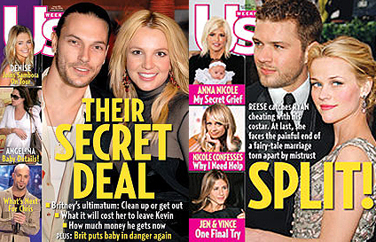역시 브리트니 스피어스와 케빈 페더라인의 이혼이 가장 쇼킹했다. 미국의 연예주간지 은 연말 특집으로 올 한해 할리우드와 미 연예계를 깜짝 놀라게한 '결별 톱 5'를 뽑아 관심을 모았다. 1. 브리트니와 케빈 2년여의 결혼 생활 끝에 '팝의 디바' 브리트니는 자신의 백댄서 출신 남편에게 돌연 이혼 통지를 했다. 부족한 노래와 춤 실력으로 데뷔 앨범 홍보에 나섰던 케빈은 철퇴를 맞은 셈. 둘 사이에는 션 프레스톤(2), 제이든 제임스(3개월) 두 아들을 뒀고 양육권과 위자료 문제를 놓고 곧 법정 소송이 벌어질 조짐이다. 제니퍼 애니스톤과 빈스 본 브래드 피트를 보낸 후 한동안 실의에 빠져있던 '프렌즈'의 수퍼스타 애니스톤. 할리우드의 개성파 배우 빈스 본과 사랑에 빠지면서 뜨겁고 격정적인 한 해를 보냈다. 그러나 곧 결혼할 듯했던 두 사람은 함께 찍은 블랙 코미디 '브레이크업'의 스토리 그대로 12월5일 결별을 공식적으로 밝혔다. 폴 매카트니와 헤더 밀스 전설적인 록그룹 '비틀스'의 멤버 폴 매카트니가 지난 5월 모델 출신 아내 밀스와 4년간의 결혼 생활을 끝냈다. 밀스는 남편 매카트니가 자신에게 모욕적인 언행을 일삼았다고 주장했지만 터블로이드 신문들이 그녀의 젊은 시절 반나 차림의 사진들을 공개하면서 비난은 양쪽 모두에게 쏟아졌다. 밀스는 18억 달러 상당의 매카트니 재산 가운데 얼마를 위자료로 받게될 지에 신경을 곤두세우고 있다. 휘트니 휴스톤과 보비 브라운 '아이 올웨이즈 러브 유'를 열창하던 '팝의 여왕' 휘트니 휴스톤이 마침내 9월 그의 악동 남편 보비 브라운과의 이혼을 선언했다. 14년 동안의 긴 결혼 생활동안 브라운은 알콜과 약물 중독 등으로 숱한 문제를 일으켰고, 재산도 흥청망청 낭비하며 휴스톤의 인생을 깎어먹었다는 여론이다. 리즈 위더스푼과 라이언 필립스 할리우드의 대표적 잉꼬 부부이던 리즈와 라이언의 이혼 소식은 전 미국을 충격에 빠뜨렸다. 7년 결혼 생활동안 남매를 낳고 키웠던 두 사람은 라이언이 바람을 피웠다는 소문이 퍼지면서 결국 이혼까지 갔다. 라이언은 이혼 발표후 "나는 완벽한 사람이 아니다. 그렇지만 이번에 이혼을 당할만한 일은 결코 하지 않았다"고 주장했다. 리즈는 영화 '앙코르'로 아카데미 여우주연상을 받은 생애 최고의 해에 이혼을 경험하며 냉 온탕을 오갔다. mcgwire@osen.co.kr 'Us'와 '피플' 표지 사진