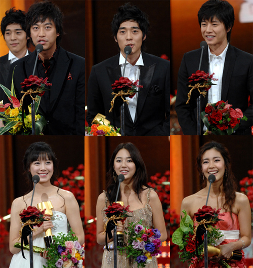 ‘2006 KBS 연기대상’의 신인상은 남녀 모두 3명씩 수상했다. 12월 31일 서울 여의도 KBS 신관 공개홀에서 열린 ‘2006 KBS 연기대상’에서 오만석, 서지석, 박해진, 구혜선, 윤은혜, 이윤지가 남녀 신인상을 차지했다. 올해 KBS는 드라마 왕국이라고 해도 좋을 만큼 많은 작품들이 시청자들의 큰 사랑을 받았다. 특히 드라마를 통해 발굴된 신인들이 KBS에는 유독 많았다. 이에 올해 신인상은 남녀 모두 3명씩, 모두 6명에게 돌아갔다. 남자부문에서는 오만석(포도밭 그 사나이), 서지석(열아홉 순정), 박해진(소문난 칠공주)이 수상했으며 여자부문에서는 구혜선(열아홉 순정), 윤은혜(포도밭 그 사나이), 이윤지(열아홉 순정)가 차지했다. 이중에서 오만석과 윤은혜는 ‘포도밭 그 사나이’에서, 구혜선과 서지석은 ‘열아홉 순정’에서 커플 연기를 펼쳐 시청자들에게 많은 사랑을 받았다. 오만석, 박해진, 구혜선은 수상 소감을 밝히다 눈물을 보였고 윤은혜는 30일 ‘2006 MBC 연기대상’에서도 ‘궁’으로 신인상을 받아 MBC와 KBS에서 신인상을 휩쓸었다. 또 이윤지는 “이제 마라톤 시작했는데 좋은 출발점 주셔서 감사하다”는 인상적인 수상소감으로 눈길을 끌었다. 2006 KBS 연기대상은 탁재훈, 최정원, 류시원의 사회로 KBS 2TV에서 160분간 생방송으로 진행됐다. orialdo@osen.co.kr