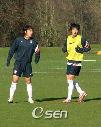 오는 7일(이하 한국 시간) 새벽 잉글랜드 프리미어리그 소속 풀햄의 홈 구장인 런던의 크레이븐 카티지에서 유럽의 만만치 않은 상대 그리스와 평가전을 가지는 한국 축구 대표팀이 첫 훈련을 가졌다. 프리미어리그에서 활약하고 있는 박지성 이영표 설기현을 제외한 17명의 선수들은 4일 런던 근교에 위치한 비샴 애비 훈련장에서 시차와 잉글랜드 땅에 빨리 적응하기 위해 첫날부터 강도높은 훈련을 소화했다. 대표팀은 스트레칭과 간단한 패싱 훈련을 통해 워밍업을 한 후 미니게임을 실시했다. 선수들의 경기 감각을 끌어올리기 위해 진행된 미니 게임에서는 김남일과 김정우 등이 골을 넣기도 했다. 베어벡 감독은 "선수들 대부분이 지난 12월 중순 이후에는 제대로 된 경기를 갖지 못했다" 며 "그들의 경기 감각을 끌어올리는 것이 중요하다" 고 말했다. 대표팀은 경기가 열리기 전날인 6일까지 비샴 애비에서 하루 한 차례씩 훈련할 할 예정이다. 또한 5일에는 풀햄 경기장에서 그리스의 오토 레하겔 감독과 기자회견도 가질 예정이다. bbadagun@osen.co.kr 이강진(왼쪽)과 조재진이 미니게임을 벌이는 모습.