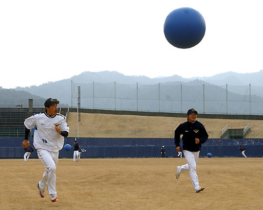 KIA가 골프공으로 타격 훈련하면 두산은 왕(王) 볼로 러닝 훈련한다. 일본 쓰쿠미에 입성, 본격적 전훈에 돌입한 두산 베어스 선수단이 '짐볼 러닝 훈련'을 도입해 눈길을 끈다. 두산 선수단은 아침 달리기 때 단조롭게 뛰기만 하는 대신, 2인 1조로 팀을 나눠 서로에게 짐볼을 튕기며 양 폴대 사이를 달리고 있다. 이에 대해 선수들은 '강도 높은 운동량을 소화하면서 재미까지 있다'고 호의적 반응을 보였다. 짐볼 달리기 때 한 조를 이룬 이종욱과 정재훈은 "생각보다 재미있다. 짐볼을 따라 뛰다보면 어느새 반대쪽 폴대에 도착해있을 정도. 짐볼을 놓치지 않으려면 전력질주를 하게 되어 일반 런닝 훈련 때 보다 더 숨이 찬다"라고 소감을 밝혔다. 이 훈련을 고안한 강흠덕 트레이너는 "그라운드에서 런닝 훈련을 실시할 때 더 효율적인 훈련 방법이 무엇인지 고민한 끝에 이 훈련을 생각해냈다. 이 훈련은 선수들의 흥미를 유발하고 팀 워크를 다지면서 동시에 더 큰 운동 효과까지 낼 수 있는 것이 특징이다"라고 설명했다. 한편 두산 선수단은 오는 16일부터 기술 및 전술 강화에 초점을 맞춘 자체 청백전에 들어간다. 이어 23일 미야자키로 이동, 요미우리와 소프트뱅크 2군, KIA와 연습경기를 통해 실전 감각을 조율할 예정이다. sgoi@osen.co.kr 두산 베어스 제공.
