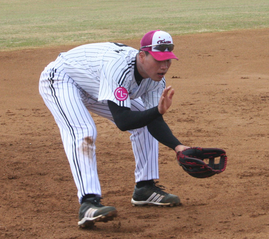 지난 시즌 종료 후 LG 트윈스 사령탑을 맡은 김재박(53) 감독과 정진호(51) 수석코치는 곧바로 ‘의미 있는’ 실험에 돌입했다. 지난 시즌 내내 LG의 고민거리였던 취약지구인 3루수 문제를 해결하기 위해 ‘2군 홈런왕’이었던 김상현(27)을 2007시즌 주전 3루수 후보로 낙점하고 담금질에 들어간 것이다. 상무에서 제대해 복귀한 김상현에게 기존 3루를 지키고 있던 최길성 등과 경쟁을 붙였다. 군입대전 3루수를 조금 봤던 김상현은 지난 시즌 상무에서 1루와 외야수로 뛰며 2군리그 홈런 및 타점왕에 오른 강타자. 공격력에서는 어느 정도 인정을 받았으나 3루수로 재전환은 일종의 ‘모험’이었다. 마무리 훈련 때부터 기존 3루수들과 경쟁에 돌입한 김상현은 기대 이상으로 적응을 해가며 현재 한창인 사이판 전지훈련에서 좋은 점수를 받고 있다. 아직 완성 단계는 아니지만 다시 시작한 3루수 치고는 괜찮은 수준이라는 평가를 얻고 있다. 현대 시절 내야 수비수들을 조련시키는 데 일가견이 있었던 정진호 수석코치는 “상현이가 상무에서 외야와 1루를 했다고 해서 처음에는 걱정했다. 그런데 3루 수비가 생각보다 괜찮다. 아직 세밀한 플레이는 부족한 것이 많지만 일본 오키나와 전훈까지 계속 수비 연습을 시키면 괜찮을 것으로 본다”며 ‘일단 합격점’을 주고 있다. 김상현은 다시 시작한 3루 수비 훈련뿐 아니라 주특기인 공격력도 배가하기 위해 김용달 타격코치와 구슬땀을 흘리고 있다. 김 코치는 “힘과 배트 스피드는 탁월한 선수다. 본인도 군에서 제대한 후 열심히 하고 있다. 군 입대 전에는 좀 기복있는 모습을 보여줘서 사이판에서는 하체 강화를 많이 주문하고 있다”고 말했다. 공수를 겸비한 ‘특급 3루수’로 재탄생하기 위해 힘을 쏟고 있는 김상현은 “3루를 보는 데 부담은 느끼지않는다. 올해가 개인적으로도 야구 인생에 무척 중요한 해라고 생각한다. 팀 내에서 내 자리를 확실히 할 수 있도록 노력하겠다"며 LG에서 '늦깎이 스타'로 탄생하겠다는 각오를 밝히고 있다. 김상현이 새로운 코칭스태프의 기대에 부응하며 올 시즌 'LG 주전 3루수'로서 활약할 수 있을지 주목된다. sun@osen.co.kr 3루 수비 훈련으로 땀을 흘리고 있는 김상현=LG 트윈스 제공.