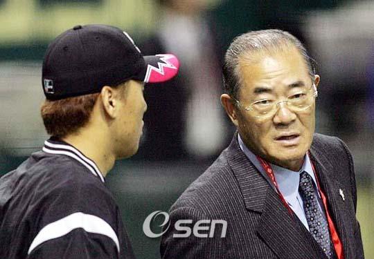 "이승엽, 50홈런을 노려라". 일본 프로야구 사상 유일의 '3000안타 타자' 장훈 씨가 16일 에 보도된 기사에서 요미우리 4번타자 이승엽(31)을 향해 "50홈런을 노리라"고 격려했다. 요미우리 구단 사상 한 시즌 50홈런을 정복한 타자는 '전설의 홈런왕' 왕정치(현 소프트뱅크 감독)와 마쓰이 히데키(현 뉴욕 양키스)뿐이다. 왕정치는 통산 3차례 50홈런 이상 시즌을 보냈고 가장 최근에는 2002년 마쓰이가 기록했다. 지난해 41홈런을 터뜨린 이승엽은 올 시즌 목표로 45홈런을 공약했기에 50홈런도 허무맹랑하지만은 않다. 이승엽은 수술받은 왼 무릎 탓에 1루 수비시 부담을 우려받고 있으나 "부담은 있지만 열심히 할 뿐"이라고 밝히고 있다. 한편 16일 첫 자체 평가전에 출격하는 이승엽은 하루 앞서 프리배팅을 가졌는데 48스윙 중 3개의 홈런을 만들어냈다. 평소보다 홈런수가 줄어든 이유는 철저하게 밀어치는 연습을 했기 때문. 넘어간 홈런 3방도 전부 좌월 홈런이었다. 16일 평가전에는 요미우리의 상징이라 할 나가시마 시게오 종신 명예감독이 경기를 참관할 것으로 알려졌다. 이에 대해 이승엽은 "(나가시마 앞에서) 최선을 다하는 플레이를 보여주겠다"고 각오를 다졌다. sgoi@osen.co.kr 지난 2005년 코나미컵 때 이승엽과 이야기를 나누는 장훈 씨.