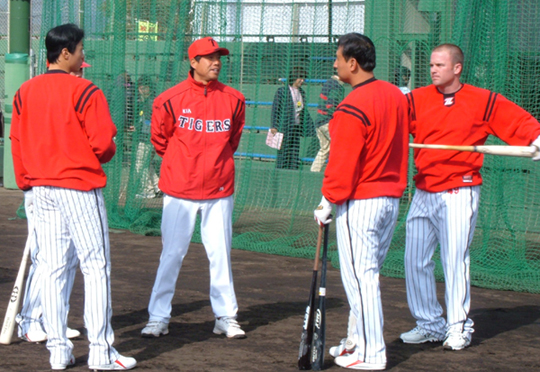KIA의 미야자키 스프링캠프에서 포성이 울리지 않는다. 지난 11일부터 본격적인 실전훈련에 돌입한 가운데 자체 청백전 3경기를 가졌으나 아직까지 시원스럽게 담장을 넘기는 타구가 나오지 않고 있다. 다른 팀 스프링캠프에서 곧잘 들려오는 홈런포 소식에 신경이 쓰일 정도다. KIA에서 홈런을 생산할 수 있는 타자들은 서튼 이재주 조경환 홍세완 장성호 정도로 꼽힌다. 3경기에서 그런 대로 안타를 쳐내기는 했지만 홈런포가 나오지 않았다. 훈련구장인 휴가시 오쿠라가하마 구장이 홈런을 터트리지 못할 정도는 아니다. 좌우 95m, 중앙 125m의 크기이다. 좌우는 짧은 반면 중앙 길이는 잠실구장과 같다. 물론 단 3경기에 불과한 데다 타자들이 서서히 컨디션을 끌어올리는 단계이기 때문에 큰 문제가 되지는 않는다. 하지만 지난해 KIA의 홈런수를 안다면 '자라 보고 놀란 가슴, 솥뚜껑 보고 놀라는 심정'일 수 있다. KIA는 지난해 홈런 73개로 6위를 기록했다. 공동 최하위인 현대 두산보다 불과 4개 많았다. 지난해 광주구장이 커지면서 동시에 홈런수도 격감했는데 결과적으로 장타력 부족으로 이어졌다. 장타력 부재로 인해 시즌 내내 힘겨운 경기를 펼친 바 있다. 20홈런을 기록한 타자가 없었으니 손쉽게 한 방으로 이기는 경기도 드물었다. 올해는 홈런왕 출신 래리 서튼은 영입했고 이재주 홍세완 조경환 등도 파워를 한층 높였다. 중량감 있는 중심타선을 앞세워 올해는 방망이로 승부를 걸 수 있을 것으로 기대받고 있다. 이들이 언제쯤 봇물 터지듯 홈런포 소식이 들려주게 될지 주목된다. sunny@osen.co.kr 이건열 타격코치(왼쪽에서 두 번째)가 서튼 등 타자들과 이야기를 나누는 모습=KIA 타이거즈 제공.