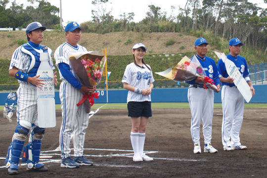 올해도 ‘위풍당당’ 양준혁(38.삼성)의 칼날 방망이는 계속될 태세다. 일본 오키나와 전지훈련 중인 삼성의 양준혁은 19일 아카마 구장에서 가진 일본 프로야구 요코하마 베이스타스와의 연습경기서 3타수 3안타 1타점의 맹타를 휘둘러 녹슬지 않은 방망이 솜씨를 과시했다. 지명타자로 이날 경기에 출장한 양준혁은 3안타 중 2안타가 2루타였다. 양준혁의 맹타에 힘입어 삼성은 요코하마와 2-2로 비겼다. 삼성은 1-2로 뒤진 9회 동점을 이뤄 무승부를 기록했다. 안타수는 10-9로 요코하마가 앞섰다. 삼성의 새로운 외국인 투수인 윌슨은 3이닝 6피안타 2실점으로 저조했으나 구원 투수진은 무실점으로 호투했다. 권오준이 윌슨에 이어 등판해 2이닝 무실점으로 기록한 것을 비롯해 조현근-안지만-정홍준-오승환이 1이닝씩을 이어던졌다. 특급 마무리 오승환은 2안타를 맞았지만 산발 처리했다. 한편 이날 경기에 앞서 일본 유명 여배우인 야스 메구미가 시구와 양팀 선수단에 꽃다발 전달해 눈길을 끌었다. 야스 메구미는 아사히음료의 모델로서 홍보차 이날 경기장을 찾았다. sun@osen.co.kr 선동렬 감독이 시구를 맡은 야스 메구미와 기념사진을 찍고 있다=삼성 라이온즈 제공