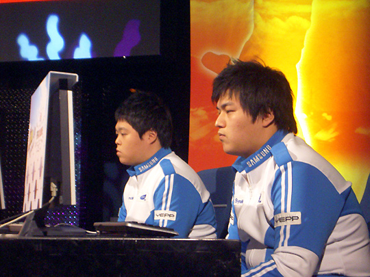 국내 최강 피파게이머라 불리는 삼성전자 박윤서(25)-전경운(23)조가 최강의 호흡을 과시하며 황학진(22)-윤성용(23)조에 압승을 거두고 썬컵 피파온라인 리그 결승에 올라갔다. 박윤서-전경운 조는 22일 서울 용산 e스포츠 상설경기장에서 열린 '썬컵 피파온라인 리그' 플레이오프전서 홈 1차전을 4-2로, 원정 2차전을 6-1이라는 완승으로 결승행 티켓을 거머쥐었다. 이로써 박윤서-전경운 조는 먼저 결승에 올라간 성열우-김정민 조와 다음달 1일 용산 e스포츠 상설경기장에서 홈 앤 어웨이 방식으로 결승전을 치른다. 공격적인 좌우 돌파에 이은 중앙 돌파로 주도권을 장악한 박윤서-전경운 조는 파상공세로 황학진-윤성용 조를 몰아부치며 완승을 이끌어냈다. 박윤서-전경운 조는 홈에서 벌어진 1차전서 4-2로 완승을 거두며 결승 진출을 사실상 예고했다. 4-4-2 전술에 키 플레이어로 질라르디노를 활용, 좌측과 우측을 계속적으로 번갈아 돌파하며 상대를 흔들었다. 전경운이 선취골을 넣자 공격의 봇물이 터지기 시작했다. 상대가 흔들리는 틈을 놓치지 않고 박윤서가 내리 세골을 쏟아넣으며 사실상 승부를 갈랐다. 1차전 완승으로 기세가 오른 박윤서-전경운 조는 2차전도 황학진-윤성용 조를 압도하며 6-1 완승으로 경기를 매조지했다. ◆ 썬컵 피파온라인 리그 플레이오프. 1차전 박윤서-전경운(AC 밀란) 4-2 황학진-윤성용(바이에른 뭔헨). 2차전 황학진-윤성용(바이에른 뭔헨) 1-6 박윤서-전경운(AC 밀란) scrapper@osen.co.kr 네오위즈 제공.