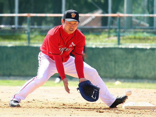 "박경완(35)의 장래를 생각해서...". 프로야구 포수 최다홈런 기록 보유자인 SK 와이번스 주전 포수 박경완은 일본 캠프 초반 연습경기에서 잇달아 1루수로 선발 출장했다. 지난 2월 24일 LG와의 '오키나와 리그' 개막전 때도 선발 포수 마스크는 정상호가 쓰고 나갔다. 그렇다고 박경완의 '개막 포수' 지위가 흔들릴 가능성은 크지 않다. 박경완과 정상호는 경쟁 관계라기보다는 후계자 관계에 가깝다. 무엇보다 김성근 SK 감독의 의중이 그래 보인다. 2월 25일 김광현-정상호 배터리를 훈련시킬 때도 김성근 감독, 가토-김상진 투수코치, 박철영 배터리 코치 외에 박경완도 있었다. 박경완은 박 코치 옆에서 정상호의 포구 폼 등에 관해 조언을 하고 있었다. 김 감독은 확실히 정상호를 미래의 SK 주전 포수감으로 점찍은 듯, 꾸짖기도 하지만 기회를 자주 주고 있다. 여기에 더불어 김 감독은 "박경완의 훗날 장래도 생각하고 있다"고 말했다. 즉, 무릎이 썩 좋지 않은 박경완이 언제까지고 포수를 맡을 수는 없기에 그 때를 대비해 1루수 수업을 시키고 있다는 의미였다. 이를 이해하기에 프로 입단 이래 처음 보는 1루수가 어색하지만 박경완도 기꺼이 훈련을 소화해왔다. 그러나 캠프가 종반에 접어들수록 박경완의 포수 선발 출장 횟수가 늘고 있다. 특히 2월 28일 야쿠르트전에서는 '미완의 대기' 김광현을 리드해줬다. 아직 박경완에 비해 관록이나 실력에서 정상호를 동렬 비교하긴 힘들다. 결국 정상호의 발전 속도와 박경완의 무릎 상태에 SK 포수 세대교체의 연착륙 여부가 걸려 있다. sgoi@osen.co.kr SK 와이번스 제공.