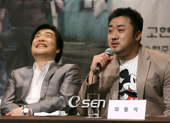 유철용 연출, 고현정 하정우 손현주 김정민 윤지민 주연의 MBC TV 월화드라마 '히트' 제작발표회가 6일 오후 서울 장충동 신라호텔에서 열렸다. 기자 간담회에서 마동석이 "체중조절을 하기위해 입맛이 떨어져도 끼니를 챙겨 먹으며 촬영에 임하고 있다"고 하자 옆자리에 있던 손현주가 부럽다는 듯이 너털웃음을 짓고 있다. /김영민 기자 ajyoung@osen.co.kr