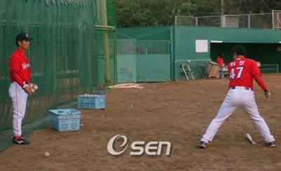 지난 6일 LG와의 평가전(7-3승)을 끝으로 SK 와이번스의 '오키나와 리그' 일정이 종료됐다. 오는 8일 귀국 예정인 SK 선수단은 이로써 고지에 이어 오키나와서 치른 56일간의 대장정을 완주했다. 가장 먼저 또 가장 강도높게 훈련을 치러 낸 SK는 오키나와에서부터 페이스가 완연히 올라있는 듯 보였다. 김성근 감독이 승부를 4월 초반으로 보고 있음을 짐작할 수 있는 대목이다. 캠프 도중 탈락자와 부상자가 속출했으나 오키나와에서 만난 김 감독은 성과에 전반적으로 만족하는 듯 비쳤다. 특히 김 감독은 캠프 기간 단기적 성과(우승) 외에 와이번스의 미래 성장동력(스타 발굴)에 주력했다. 이 파생물이 김성근의 '황태자 4인방', 김광현-정상호-최정-김강민이다. SK 구단 사상 최고 계약금(5억 원) 신인이자 좌완 선발로서 잠재력을 지닌 김광현(19)은 일찌감치 김성근의 눈에 들었고, 군에서 제대한 포수 정상호도 '박경완의 후계자'로서 시험받고 있다. 여기에 김 감독은 외야 주전 중견수로 김강민을 사실상 낙점했다. 이에 따라 SK의 외야는 이변이 없는 한 박재홍(좌)-김강민(중)-이진영(우)으로 짜여질 전망이다. 4인방 중에서도 특히 김 감독이 흐뭇해 하는 선수는 최정이다. 김 감독은 사석에서 "무얼 시켜도 못한다고 하는 법이 없다"라고 꼭집어 칭찬할 정도로 마음에 들어했다. 특히 3루 수비에 대해서는 "어떤 타구가 가도 다 잡아낸다"라고 인정했다. 김 감독은 SK의 숱한 평가전 와중에서도 유독 최정만은 단 한 차례도 교체시키지 않고 풀타임 출장시켰다.스치히터 전향 실패로 일시적 슬럼프에 빠지기도 했으나 밀어붙였고 2월 말에는 야쿠르트 1군을 상대로 홈런포를 터뜨리는 등 기대에 부응했다. 대다수 야구 전문가들은 객관적 전력을 토대로 이미 SK를 우승 후보로 놓고 있다. 여기에 계산에 넣지 않은 '신 4인방'의 활약까지 어우러진다면 창단 첫 한국시리즈 직행은 더욱 가까워질 것이다. sgoi@osen.co.kr 김성근 감독이 최정의 타격 자세를 지도하는 모습.