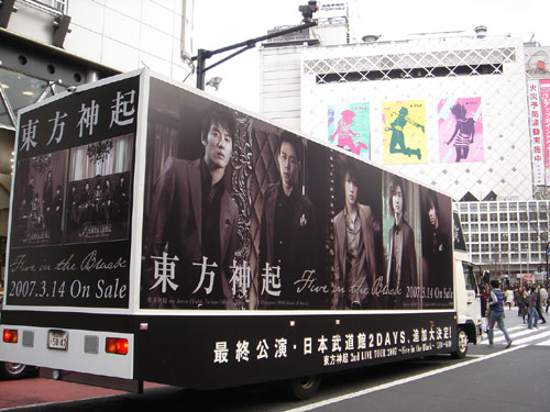 그룹 동방신기의 이미지로 도배된 대형 랩핑카가 일본 도쿄의 중심지를 순회하고 있다. 3월 6일부터 시작된 이 순회는 14일 발매될 동방신기의 일본 두 번째 정규앨범 ‘Five in the Black'을 앞두고 펼치고 있는 홍보 이벤트이며 재킷 사진으로 도배된 랩핑카는 시부야, 롯폰기, 신주쿠 등 도쿄 중심가 어디서든 쉽게 만날 수 있다. 또한 동방신기 랩핑카에는 오는 5월 10일부터 6월 16일까지 일본 9개 도시(도쿄, 오사카, 니가타, 삿포로,센다이,고베, 시가현, 아이치현, 후쿠오카)에서 14회에 걸쳐 펼쳐지는 ‘동방신기 2nd LIVE TOUR 2007~Five in the Black~’이 전회 매진을 기록해 도쿄 부도칸에서 6월 18, 19일 각각 1회씩 추가 공연이 결정됐음을 알리는 문구도 함께 적혀있다. 앨범 발매에 앞서 지난 7일 선보인 일본 10번째 싱글 ‘Choosey Lover’가 발매 당일 오리콘 싱글 차트 4위에 오르며 10연속 오리콘 톱10 진입의 대기록을 달성한 만큼 이번 정규앨범에 대한 반응에 기대가 모아지고 있다. 동방신기가 앨범 홍보를 위해 선택한 랩핑카 순회는 이달 말까지 계속될 예정이다. hellow0827@osen.co.kr