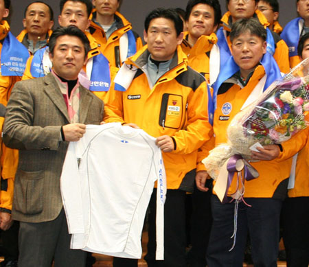 세계 최초 히말라야 16좌 완등에 도전하는 '2007년 한국 로체샤르남벽 로체남벽 원정대'가 지난 9일 선발대를 시작으로, 19일 본대 출국을 앞두고 있다. 엄홍길(47, 트렉스타) 원정대장을 축으로 고인경 원정단장, 홍성택 등반대장 등 총 18명(남 17명, 여 1명)의 대원들은 로체샤르(8400m) 남벽과 히말라야 최대 난코스라 불리는 80도 경사의 로체(8516m) 남벽에 차례로 도전할 계획이다. 이번 도전 성공을 위해 장비 선택에 심혈을 기울인 원정대가 등반용 속옷으로 토종 브랜드 ‘스켈리도’를 선택해 눈길을 끌고 있다. 옷이 아니라 필수 장비 개념으로 개발된 퍼포먼스 스포츠기어(Performance Sports Gear) 스켈리도는 주로 이너웨어로 활용되는 스포츠웨어. 원정대는 ‘스켈리도’ 상하의 150벌을 제공받아 땀배출을 극대화하고 체온을 조절하게 된다. 스켈리도 이너웨어는 땀을 수 초 안에 옷 밖으로 밀어내는 초고속 땀배출 기능을 가져 차가운 바깥 기온에도 체온을 유지시킨다. 신체의 통증점, 인대점을 누르는 라인이 있어 부상을 막아주며 근육 피로를 없애는 효과를 가진다. 특히 국내 벤텍스사가 개발한 드라이존(DRY-ZONE) 원단은 지난 2002년 일본 남극탐험대가 탐험 기간 내내 입은 스포츠 언더웨어 소재로 알려졌다. 이번 엄홍길 원정대에 속옷을 제공한 스켈리도스포츠의 윤진혁 대표는 “스켈리도 원사 폴리오레핀은 미국 특수부대의 극한기 훈련용으로 개발됐으며, 다이옥션이 방출되지 않는 첨단 소재로 매우 가볍다. 탁월한 기능성 이너웨어로 역할을 다해 등반과정을 소중히 여기는 대원들에게 더 없이 필요한 장비가 될 것”이라고 밝혔다. 설원을 누비는 자랑스런 한국인 엄홍길 대장은 1988년 에베레스트를 시작으로 1999년 안나푸르나, 2000년 K2를 정복해 왔으며, 지난 2003년 로체샤르 정상을 불과 150m 앞두고 눈사태를 맞아 대원 2명을 잃은 바 있다. 한국 산악인구 1000만 명 시대를 맞아 좌절에 굴하지 않고 꿈을 향해 떠나는 그의 발길은 한국인의 긍지를 다지는 계기가 될 것이다. sun@osen.co.kr '2007년 한국 로체샤르남벽 로체남벽 원정대'의 히말라야 16좌 완등 성공을 위해 토종 기능성 스포츠 이너웨어 스켈리도 150벌이 제공되었다. 앞줄 오른쪽부터 엄홍길 원정대장, 홍성택 등반대장, 스켈리도스포츠 윤진혁 대표./스켈리도 제공.