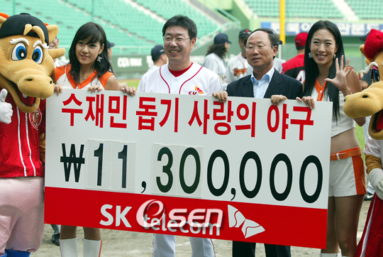 SK 와이번스는 MBC ESPN, 인천광역시 시설관리공단과 공동으로 '2007 MBC ESPN 연예인 야구리그'를 인천 문학야구장에서 치르기로 확정했다고 14일 밝혔다. 이로써 SK는 올 시즌 모든 주말 홈경기 종료 20분 후 연예인 야구경기를 한 경기씩 진행, 야구장을 찾은 홈팬들에게 또다른 볼거리와 즐거움을 제공할 예정이다. 개막전과 결승전 등 주요 경기는 항상 인천 문학야구장에서 진행되고 MBC ESPN을 통해 중계된다. 이번 '연예인 야구리그의 인천 유치'는 올 시즌 홈팬들의 즐겁고 행복한 야구관람을 위해 힘쓰고 있는 SK 구단의 '스포테인먼트' 일환이다. 'MBC ESPN 연예인 야구리그'는 작년에 이어 올해도 계속 진행되는 대회이며 유재석, 이휘재, 정준하, 유준상, 김제동, 김건모, 안재욱, 이성재 등 유명 스타들이 직접 야구 유니폼을 입고 경기에 많은 야구팬들의 관심을 얻고 있다. 이 대회는 총 56경기가 진행되는데 그 중 26경기가 인천 문학구장에서 열린다. 한편 올 시즌 연예인 야구리그는 18일 오후 5시부터 문학구장에서 '한'-'재미삼아', '조마조마'-'알바트로스'의 경기를 시작으로 별도의 개막식이 진행된다. 작년 대회 준우승팀인 '한'의 간판타자인 정준하(개그맨)씨는 "모든 연예인 야구단을 대표하여 메이저리그급 구장인 문학야구장에서 경기를 가질 수 있게 해준 SK 와이번스 및 관계자 여러분께 감사드린다. 작년에 처음 연예인 야구리그가 생기면서 건강과 친목을 다질 수 있어서 고마웠다. 올해도 연예인 야구리그다운 모습으로 최선을 다해 조금이나마 야구 저변확대에 기여했으면 좋겠다"고 소감을 밝혔다. sun@osen.co.kr 작년 7월 인천 문학 야구장에서 SK 와이번스 코칭스태프 및 프런트 연합팀과 연예인 야구단 올스타의 '수재민 돕기 사랑의 야구 경기' 후 SK 신영철 사장과 엠게임 권이형 부사장이 수재의연금을 기탁하고 있다