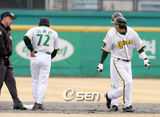 17일 2007프로야구 시범경기가 수원 광주 마산 제주에서 일제히 열렸다. 수원에서 벌어진 현대 유니콘스와 두산 베어스의 경기 1회말 1사 1,2루 이숭용의 좌익수 플라이 때 1루주자 이택근이 2루를 지나친 뒤 1루로 백업할 때 2루를 안밟았고 돌아갔다며 2루심이 아웃을 선언하자 이광근 코치와 이택근이 밟았다며 어필하고 있다./수원=손용호 기자spjj@osen.co.kr