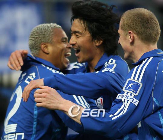 '원샷 원킬' 나드손도 1년 10개월 만에 K리그 복귀골을 쏜 가운데 수원 삼성이 최단기간 200승 기록을 달성했다. 수원은 17일 수원 월드컵 경기장에서 벌어진 부산과의 삼성 하우젠 K리그 2007 3라운드 홈경기에서 나드손의 그림같은 프리킥 선취골에 힘입어 1-0으로 승리했다. 이로써 433경기 만에 200승(122무 111패) 고지를 달성한 수원은 정규리그 2승 1무로 울산 현대, 성남 일화, 포항과 함께 승점 7이 됐으나 골득실에서 밀려 4위를 기록했다. 수원이 이기긴 했지만 대전과의 삼성 하우젠컵 2007 대회에서 대승을 거둔 것을 비교할 때 결코 만족할 수 없는 승리였다. 대전과의 경기에서 곽희주와 이관우가 동반 부상당하며 빠진 영향이 컸고 특히 공수를 조율하는 이관우의 자리는 커보였다. 이 때문에 중원 경쟁에서 부산을 압도하지 못했고 종종 포백 수비가 뚫리며 오히려 위험한 장면을 맞기도 했다. 특히 전반 10분 페르난도의 오른쪽 코너킥에 이은 윌리암의 헤딩슛이 비록 빗나가긴 했지만 수원팬들의 가슴을 쓸어내리기에 충분했다. 또 수원도 전반 13분 에두의 패스를 받은 안정환의 슈팅이 상대 골키퍼 정유석의 선방에 막히는가 하면 전반 28분 조원희의 프리킥에 이은 에두의 헤딩슛이 크로스바를 살짝 넘어가는 등 결정적인 득점 기회를 놓치며 전반을 득점없이 끝냈다. 홈에서의 무승부는 의미가 없다고 판단한 차범근 감독은 후반 17분 안효연을 빼고 나드손을 투입시키며 에두, 안정환 투톱에서 스리톱으로 전술 변화를 꾀했고 결과적으로 승부수는 맞아떨어졌다. 후반 24분 심재원의 파울로 페널티지역 왼쪽 바깥지역에서 얻은 프리킥을 나드손이 오른발로 감아찼고 골키퍼 정유석이 손 쓸 틈도 없이 왼쪽 골망을 흔들었다. 그러나 수원은 나드손이 후반 29분 부산 박규선으로부터 얻은 페널티킥을 직접 찼지만 크로스바를 어이없이 넘기는 실축을 했고 에두 역시 골키퍼와 1대 1로 맞서는 결정적인 기회를 맞았지만 추가골 사냥에 실패했다. 부산은 후반 42분 이승현의 결정적인 슈팅이 백지훈의 감각적인 수비에 막히는 등 끝내 동점골을 뽑아내지 못하고 또 하나의 패배를 추가했다. ■ 정규리그 3R 전적 (17일) ▲ 수원 수원 1 (0-0 1-0) 0 부산 * 득점 = 나드손 1호(후24분·수원) tankpark@osen.co.kr 나드손이 프리킥을 선제골로 연결시킨 뒤 안정환과 포옹하고 있다./수원=손용호 기자spjj@osen.co.kr