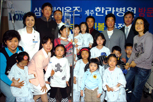 삼성 라이온즈가 유소년 야구 보급에 앞장서고 있다. 지날 달 27일 대구지역 병원 소아병동을 방문해 글러브와 안전구를 기증했던 삼성은 지난 17일 제주 오라구장에서 열린 시범경기 개막전을 마치고 오승환 조동찬 박진만 등이 제주시 연동 한라병원을 방문해 어린이 환우들에게 글러브와 사인볼을 증정하고 쾌유를 기원했다. 또 아마야구 저변 확대와 야구 붐을 조성하기 위해 지난 1990년 삼성 라이온즈 리틀 야구단을 운영해 어린이들에게 마음 놓고 야구할 수 있는 공간을 제공하고 야구에 대한 흥미를 주고 있다. 특히 지난달 경남 김해에서 11개 팀이 참가한 가운데 열린 '해동기 전국 리틀야구대회'에 4강에 오르며 클럽 야구의 성공 가능성을 보여줬다. 정지규 삼성 홍보팀 대리는 "어린이들은 최고의 야구팬이다. 어린이들이 야구에 대한 흥미를 가질 수 있는 각종 이벤트를 계획 중"이라고 밝혔다. 이어 "선수들도 1승 혹은 홈런 1개당 일정 금액을 적립해 유소년 발전기금을 조성할 계획"이라고 덧붙였다. 지난 2005년 국내 프로야구단 최초로 장학회를 출범해 장학금 전달 등 활발한 활동을 하고 있는 삼성은 앞으로도 공인으로서 사회적 책임과 의무를 다하며 야구의 저변 확대를 위해 노력할 계획이다. what@osen.co.kr 오승환 조동찬 박진만 등이 지난 17일 제주시 한라병원에 입원 중인 어린이를 위문하고 글러브를 선물한 뒤 기념 촬영을 하고 있다. / 삼성 라이온즈 제공.