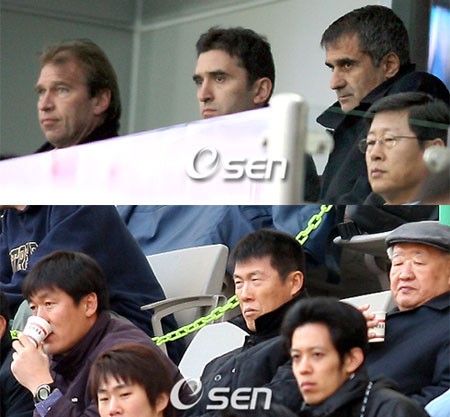 오는 21일 K리그의 대표적 빅매치인 FC 서울과 수원 삼성의 경기를 앞두고 양 팀 감독들도 분주해졌다. 세뇰 귀네슈 서울 감독과 차범근 수원 감독은 지난 주말 서로 상대팀의 경기장을 찾아 상대팀 전력 분석에 여념이 없었다. 이같이 양 팀 감독들이 서로에 대해 신경을 쓰고 있는 것은 양 팀이 K리그의 대표적인 라이벌이기 때문. 특히 올 시즌은 세뇰 귀네슈 감독이 처음으로 서울을 맡아 첫 맞대결에서 승리하고자하는 감독들의 자존심 대결도 치열하다. 지난 17일 부산과의 K리그 3라운드에서 승리한 차범근 감독은 경기 후 인터뷰에서 "원정경기이지만 잘할 수 있도록 노력하겠다" 며 "출발이 좋았으니 계속해서 잘하고 싶다" 고 말했다. 18일 제주전에서 승리를 거둔 귀네슈 감독 역시 수원전에 대해 "재미있지만 어려운 경기가 될 것"이라며 "월요일부터 준비를 열심히 하겠다" 고 말했다. 올 시즌 첫 맞대결이자 세계적 명장과 국내 대표 감독간의 대결로 기대를 모으는 삼성 하우젠컵 2라운드 서울과 수원과의 대결. 이 대결은 오는 21일 오후 8시 상암동 서울 월드컵 경기장에서 펼쳐진다. bbadagun@osen.co.kr 지난 17일 수원 구장을 찾은 귀네슈 감독(위)과 18일 상암 구장서 관전하는 차범근 감독.
