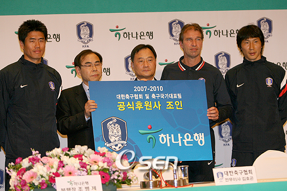 대한축구협회와 하나은행이 공식 후원 계약을 연장했다. 22일 서울 홍은동 그랜드힐튼 호텔에서 열린 조인식에는 대한축구협회 김호곤 전무 이사와 조병제 하나은행 부행장, 핌 베어벡 대표팀 감독과 설기현, 김상식 등이 참여했다. 98년부터 대한축구협회 공식 스폰서를 맡아온 하나은행은 이번 계약을 통해 2010년까지 공식 스폰서로 한국 축구 발전에 이바지하게 된다. 하나은행은 A매치 보드광고권과 A매치 타이틀 스폰서가 될 수 있고 FA컵 타이틀스폰서도 맡는다. bbadagun@osen.co.kr