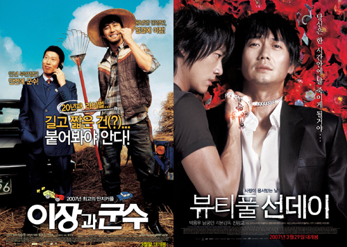 페르시아 대군 맞서 싸운 300명의 스파르타 전사들의 열기가 대단하다. 이런 가운데 한국영화 남성듀오들이 외화 ‘300’의 인기를 뛰어넘을 수 있을지 귀추가 주목된다. 3월 29일 개봉한 ‘이장과 군수’의 차승원-유해진, ‘뷰티풀 선데이’의 박용우-남궁민이 바로 그들이다. 차승원과 유해진은 순박한 시골마을 이장과 소신을 가진 군수로 분해 관객들의 웃음을 자극한다. 박용우와 남궁민은 사랑 때문에 되돌릴 수 없는 죄를 저지른 남자의 모습을 그린다. 3월 14일 개봉한 ‘300’이 여전히 주말 영화 예매율(맥스무비 기준)에서 두각을 나타내고 있다. 이런 가운데 ‘이장과 군수’와 ‘뷰티풀 선데이’가 ‘300’의 아성에 도전한다. ‘이장과 군수’가 개봉 첫 주말이라는 유리함을 바탕으로 28.52%로 예매율 1위에 랭크돼 있다. ‘뷰티풀 선데이’는 다소 떨어진 7.17%를 기록하고 있다. 하지만 ‘300’은 개봉 3주차 주말임에도 불구하고 여전히 26.84%라는 높은 예매율을 기록하고 있다. 뿐만 아니라 파트리크 쥐스킨트의 동명의 원작소설을 영화화한 ‘향수-어느 살인자의 이야기’도 16.35%로 예매율 3위를 차지해 외화의 공세가 여전하다. 3월 한국영화의 극심한 부진이 눈에 띄었던 극장가에 ‘이장과 군수’와 ‘뷰티풀 선데이’가 과연 한국영화 부활의 신호탄을 쏠 수 있을지 관심이 쏠리고 있다. pharos@osen.co.kr
