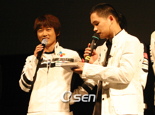 프로게임단 CJ 엔투스가 1일 오후 3시 서울 압구정 CGV에서 많은 팬들이 참석한 가운데 e스포츠 사상 최초의 공식 팬미팅을 열었다. CJ 구단은 14일 '프로리그 2007' 전기리그 시작을 앞두고 팬 서비스와 선수단 사기 진작을 위해 이번 행사를 개최했다. '퍼펙트 테란' 서지훈이 인기 개그맨 김형인의 질문에 "나도 알고보면 따뜻한 남자"라고 얘기하고 있다./ 고용준 기자 scrapper@osen.co.kr