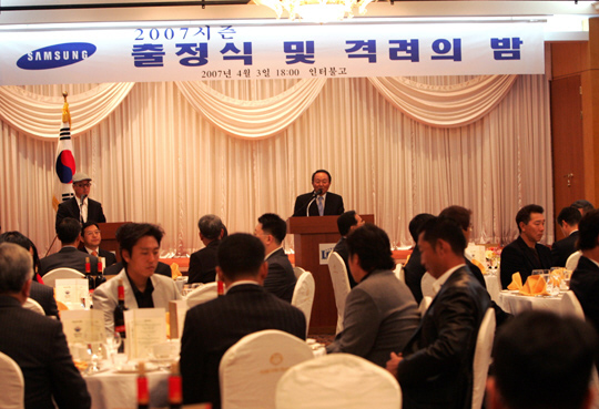 '한국시리즈 3연패를 위하여'. 삼성 라이온즈(사장 김응룡)가 지난 3일 오후 6시 대구 수성구 만촌동 호텔 인터불고 카멜리아홀에서 이수빈 구단주, 김응룡 사장, 김재하 단장, 선동렬 감독과 코칭스태프 및 선수단, 대구 경북지역 삼성 계열사 임원 등 80여 명이 참가한 가운데 행사를 가졌다. 이날 사회를 맡은 삼성 라이온즈 홍보대사 개그맨 김홍식은 행사 시작에 앞서 "코칭스태프와 선수들이 똘똘 뭉쳐 한국시리즈 3연패가 이뤄지길 기원한다"고 말했다. 이수빈 삼성 라이온즈 구단주는 인사말을 통해 "2년 연속 한국시리즈 우승은 선수들의 실력뿐만 아니라 대구시민의 사랑과 팬들의 열정이 있었기에 가능했다"며 감사의 마음을 표현했다. 이어 이 구단주는 "올 시즌 8개 구단 모두 전력이 향상돼 박진감 넘치는 경기를 펼칠 것으로 기대된다. 삼성 라이온즈는 명실공히 명문 구단답게 팬들에게 좋은 모습을 보이겠다"며 팬들의 아낌없는 성원을 부탁했다. 한편 삼성은 4일 대구구장에서 훈련 후 야간경기에 대비한 청백전을 가진다. what@osen.co.kr 삼성 라이온즈 제공.