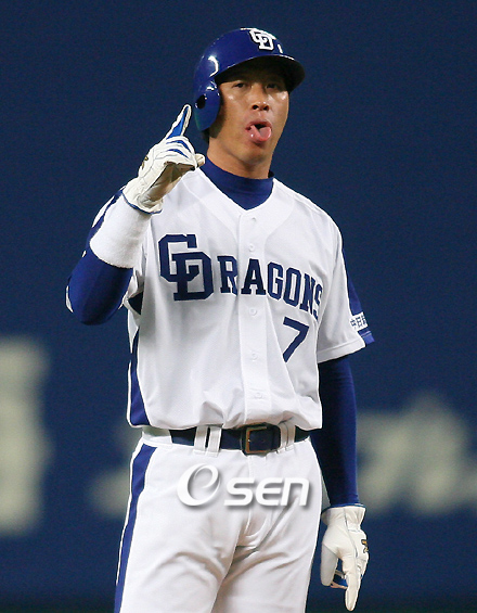 주니치 드래건스의 이병규가 6일 나고야돔에서 요코하마 베이스타스를 상대로 7게임 연속 안타를 기록했다. 이병규가 1회말 1사 1,2루서 좌전 안타로 타점을 올리고 1루에 진루한 뒤 나카무라의 유격수 땅볼 때 요코하마 2루수 니시의 포구 실책으로 2루서 세이프된 후 3루코치를 향해 손가락을 들어 보이고 있다./나고야돔=손용호 기자spjj@osen.co.kr