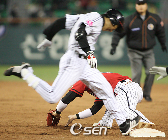 2007 삼성 PAVV 프로야구가 6일 저녁 4개 구장에서 사상 첫 야간경기로 막을 올렸다. 잠실구장에서는 LG 트윈스와 KIA 타이거즈가 격돌했다. LG의 4회말 1사 2루서 오태근이 투수 앞 번트를 댄 뒤 1루에서 간발의 차로 아웃되고 있다. KIA 2루수 김종국이 1루에 백업을 들어와 포구했다./잠실=김영민 기자ajyoung@osen.co.kr