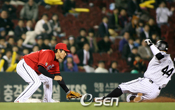 2007 삼성 PAVV 프로야구가 6일 저녁 4개 구장에서 사상 첫 야간경기로 막을 올렸다. 잠실구장에서는 LG 트윈스와 KIA 타이거즈가 격돌했다. LG의 4회말 무사 2루서 권용관의 투수 앞 희생번트 때 KIA 3루수 이현곤의 포구 에러로 2루 주자 조인성이 3루에서 살고 있다. 볼이 빠지면서 조인성은 홈까지 들어갔다./잠실=김영민 기자ajyoung@osen.co.kr