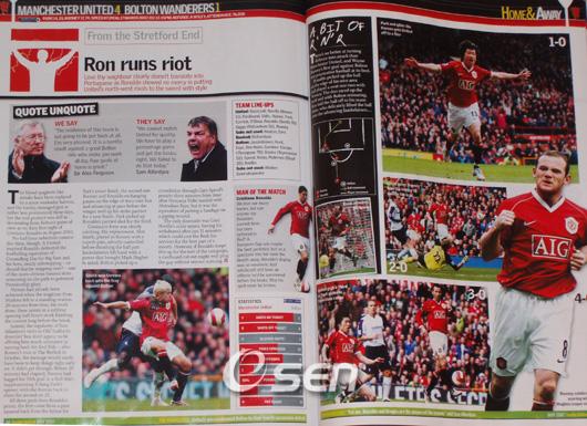 [OSEN=런던, 박세봉 통신원] '한국인의 비상을 알리는 골이었다'. 맨체스터 유나이티드(이하 맨유)가 발간하는 잡지인 '인사이드 유나이티드' 최근호는 현지 날짜로 지난 3월 벌어진 경기 내용에 대해 자세히 소개하면서 박지성의 사진을 실어 눈길을 끌었다. 인사이드 유나이티드는 지난달 17일(이하 한국시간) 볼튼전에 대해 설명하는 기사와 함께 박지성이 골을 뽑고난 후 골 세리머니를 펼치는 사진을 실었다. 이에 대해 '박지성의 날갯짓 : 한국인의 비상을 알리는 첫 골' 이라는 설명을 덧붙였다. 또한 인사이드 유나이티드는 'R n R' 이라는 제목으로 루니와 크리스티아누 호나우두의 멋진 역습 장면에 대해 분석하는 그림과 사진을 게재했다. 그 아래 이날 경기의 세 번째 골이자 박지성의 2번째 골 득점 장면을 실으며 박지성의 활약이 대단했음을 보여주었다. 한편 박지성은 오는 8일 새벽 열리는 포츠머스와의 경기는 물론 약 2주간 경기를 뛸 수 없게 되었다. 알렉스 퍼거슨 감독은 7일 맨유 홈페이지와 인터뷰를 통해 박지성이 당분간 경기에 나설 수 없다고 밝혔다. 퍼거슨 감독은 "박지성은 준비가 안될 것" 이라며 "정밀 검사를 위해 전문의에게 보냈다. 앞으로 2주간 박지성의 몸상태를 지켜보겠다" 라고 말했다. easterday315@hotmail.com