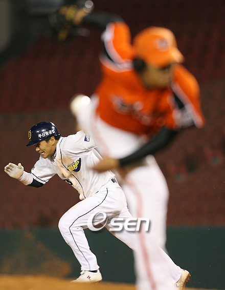 12일 잠실구장에서 벌어진 2007 프로야구 두산 베어스와 한화 이글스의 경기는 두산 김동주의 악송구로 승패가 갈렸다. 1-1이던 한화의 9회초 2사 후 백재호의 3루 깊은 땅볼을 잡은 김동주가 1루에 원바운드로 송구한 것을 1루수 정원석이 잡지 못하고 뒤로 빠트려 한화가 2-1로 이겼다. 두산의 8회말 1사 후 1루주자 이종욱이 한화 선발투수 류현진의 투구폼을 빼앗아 2루 도루를 시도하고 있다. 그러나 한화 포수 신경현의 빠르고 정확산 송구로 아웃돼 시즌 처음으로 도루에 실패했다. /잠실=손용호 기자spjj@osen.co.kr