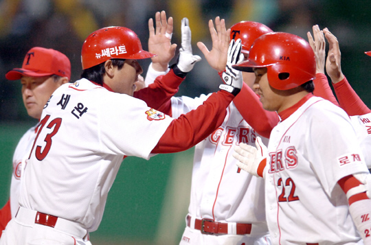KIA 타이거즈가 폭발적인 공격력을 앞세워 삼성 라이온즈를 물리쳤다. KIA는 15일 광주구장에서 열린 삼성과의 홈경기에서 홍세완의 홈런포를 앞세워 7-4로 승리했다. 전날 연타석 홈런을 기록한 홍세완은 KIA가 2-1로 앞서던 6회말 1사 만루에서 삼성 선발 전병호를 상대로 비거리 125m짜리 좌월 만루 홈런을 뽑아내며 삼성의 추격 의지를 꺾었다. 이어 7회 서튼의 적시타로 한 점을 추가, 7-4로 승부를 갈랐다. 삼성은 7회 박진만-조영훈-김창희의 연속 안타로 1점을 만회한 뒤 진갑용과 박종호의 내야 땅볼로 2점을 더 따라갔지만 경기를 뒤집지 못했다. KIA 선발 에서튼은 6이닝 3피안타 1볼넷 6탈삼진 1실점으로 호투하며 시즌 첫 승을 거뒀고 8회 등판한 마무리 한기주는 1⅓이닝 1볼넷 2탈삼진 무실점으로 호투, 시즌 3세이브째를 올렸다. 홍세완은 6회 만루 홈런 포함 4타수 2안타 4타점으로 팀 타선을 이끌었다. 삼성 선발 전병호(6이닝 7피안타 2볼넷 2탈삼진 6실점)는 6회 홍세완에게 만루 홈런을 허용, 쓴 잔을 마셔야 했다. 서정환 KIA 감독은 "6회까지 에서튼이 정말 잘해줬다. 에서튼도 서서히 한국야구에 적응한 것 같다. 홍세완의 타격감이 조금씩 올라오는 것 같아 고무적이다"고 이날 경기를 평가했다. 선동렬 삼성 감독은 "투수들이 아직 페이스가 올라오지 않은 것 같다. 전병호의 경우 낮게 제구돼야 하는데 전체적으로 볼이 높았다. 투수들의 페이스가 올라오는 것이 중요하다"고 밝혔다. what@osen.co.kr 6회말 만루홈런을 날린 홍세완이 팀 동료들에게 환영받고 있다. / KIA 타이거즈 제공.