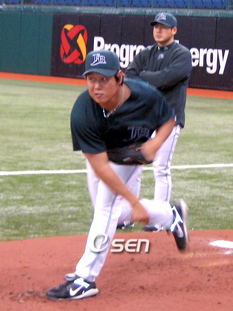 17일(한국시간) 볼티모어 오리올스와의 홈경기에 앞서 트로피카나필드에서 불펜피칭을 하고 있는 탬파베이 데블레이스의 유제국을 옆에서 지켜보고 있는 서재응의 표정이 진지하다. 유제국은 지난 11일 텍사스전 이후 등판하지 않았다. 유제국은 "선발이 무너진 경기가 없어 그간 등판하지 않았다. 몸을 풀라는 코치의 지시도 없었다"고 말했다. /세인트피터스버그=김형태 특파원 workhorse@osen.co.kr