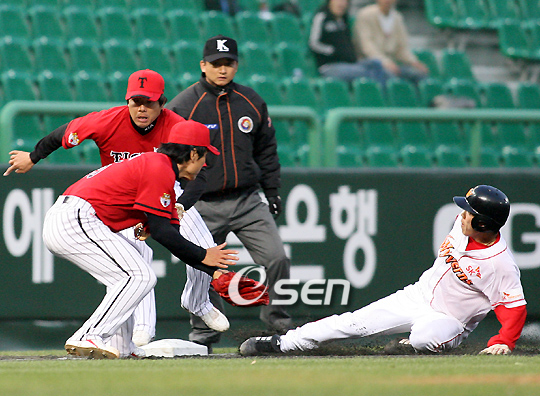 2007 프로야구 SK 와이번스와 KIA 타이거즈의 경기가 19일 인천 문학구장에서 벌어졌다. 이날 경기는 부상에서 복귀한 KIA 이대진과 좀체로 첫 승을 올리지 못하고 있는 SK 기대주 김광현이 선발 맞대결을 벌였다. 2회말 1사 2루서 박재홍의 3루 땅볼 때 공이 1루로 송구되는 사이 2루주자 정근우가 3루를 파고들어 세이프 되고 있다. 투수 이대진이 직접 3루 커버를 들어가 태그를 시도하고 있다./인천=손용호 기자spjj@osen.co.kr