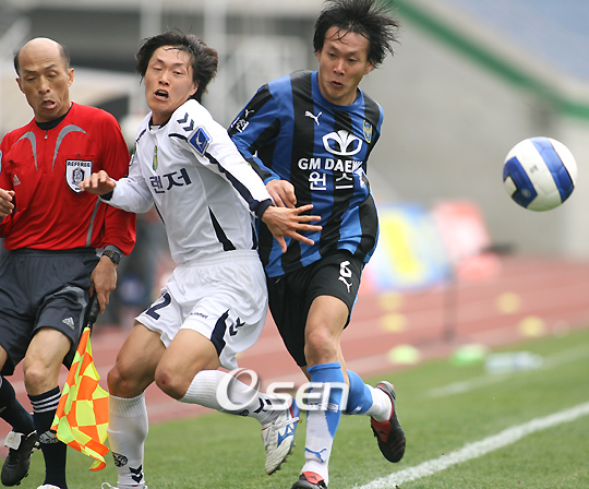 '삼성 하우젠 K-리그 2007' 인천 유나이티드와 전북 현대의 경기가 21일 문학 월드컵경기장에서 벌어져 전북이 염기훈의 두 골과 제칼로의 한 골을 보태 인천에 3-1로 승리했다. 인천은 경기 시작과 함께 부상으로 교체된 데얀의 공백이 컸다. 후반 전북 전광환의 공격을 인천 김학철이 수비하는 과정에서 안상기 부심과 충돌하고 있다./인천=손용호 기자spjj@osen.co.kr