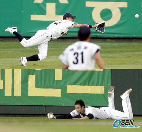 롯데 외야수 최경환(35)은 ‘허슬 플레이’를 잘하는 선수로 정평이 나 있다. 두산 시절부터 몸을 사리지 않는 플레이로 팬들의 사랑을 받고 있다. 타격한 후 항상 전력질주하는 모습, 과감한 주루 플레이, 다이빙도 마다하지 않는 외야 수비 등 미국야구에서 경험한 바를 그대로 실천하며 팀에 활력을 불어넣는 한편 팬들을 즐겁게 한다. 또 롯데의 ‘황태자’였던 윤학길(46) 상무 코치가 현역시절 보여줬던 철완도 팬들의 기억에 생생한 ‘투수 허슬플레이’였다. 윤 코치는 현역 때 100완투를 기록하며 강철 어깨와 구위를 자랑했다. ‘투수 분업화’란 미명 아래 완투 완봉승이 점점 줄어들고 있는 현재와 비교하면 윤 코치의 100완투는 ‘투수 허슬플레이’의 표본이다. 근년 들어서 한국 프로야구에는 투수와 야수들의 ‘허슬 플레이’가 점점 사라지고 있어 프로야구의 흥미도 떨어지고 있다. 투수나 야수 모두가 너무 몸을 사리는 경향이 갈수록 심해지고 있는 것이다. 그로 인해 경기 시간이 길어지는 한 요인이 되고 있다는 게 전문가들의 지적이다. 현역 시절 최고투수 출신인 정명원(41) 현대 투수코치는 “요즘 투수들은 너무 몸을 사린다. 선발 투수가 5, 6회 승리투수 요건만 채우면 마운드를 데려올 생각부터 하는 것 같다. 조금만 아파도 공을 던지기 싫어한다. 아무리 몸이 재산인 프로선수들이라지만 선발 투수는 7이닝 정도를 소화해줘야 한다. 그래야 투수 교체가 적어지고 경기 시간도 단축된다”며 최근 선발투수들이 짧게 던지는 것을 아쉬워했다. 또 다른 야구 관계자는 “외야수들의 다이빙 캐치를 점점 보기가 힘들어지는 것 같다. 내야수들도 마찬가지다. 또 중요한 상황서 몸에 맞는 볼을 맞을 경우 아픈 내색 없이 달려나가는 선수도 별로 없다”면서 “프로야구 전성기인 1990년대 중반 허슬 플레이의 대명사였던 롯데 공필성과 박정태(이상 현 롯데코치)의 몸을 사리지 않는 플레이가 그립다”며 최근 경향을 꼬집었다. 프로야구 전문가들은 ‘허슬 플레이’가 갈수록 줄어들고 있는 이유 중 하나로 FA(프리에이전트) 제도에 대한 잘못된 이해를 들고 있다. 몸이 재산인 선수들이 오랫동안 선수생활을 영위하고 ‘FA 대박’을 터트리기 위해 부상 위험이 있는 ‘허슬 플레이’를 피하고 있다는 분석이다. 하지만 이런 것은 한국야구의 장래를 좀 먹는 행위로 전문가들은 지적하고 있다. 전문가들은 “팬들은 박진감 넘치는 야구, 특급 선발투수들의 완투 완봉 등을 보고 싶어 한다. 느슨한 플레이로 질질 늘어지는 경기는 팬들의 외면을 산다. 그럼 결국 손해는 누가 보겠는가. 팬이 흥미를 잃고 떠나면 결국 선수들의 존재 이유가 없어지는 것이다. 치열한 경쟁사회인 미국 메이저리그에서는 선수들이 살아남기 위해 허슬 플레이를 펼치고 팬들은 박수를 보낸다”면서 선수들의 각성을 촉구했다. 롯데 팬들이 ‘선수들이 포기하지 않으면 팬들도 포기하지 않는다’는 격문이 새겨진 플래카드를 들고 응원하는 것처럼 모든 프로야구 선수들이 팬들과 함께 즐거운 야구를 하기 위해 열심히 뛰어야할 시점이다. 물론 부상없이 오랜동안 선수생활을 하며 팬들의 사랑을 받는 것이 가장 중요한 덕목이지만 ‘FA 대박’만을 염두에 둔 듯한 지나치게 몸을 사리는 플레이는 팬들로부터 비난을 받을 수 있다. 한국야구의 중흥을 위해 선수들이 질높은 플레이를 팬들에게 선물할 시점이다. sun@osen.co.kr 최경환의 두산 시절 수비 장면.