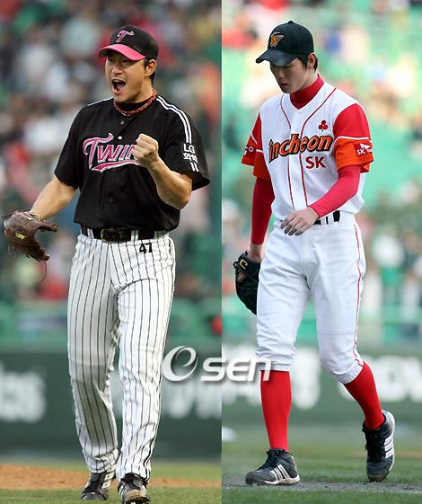 LG 봉중근이 SK 김광현과의 좌완 맞대결에서 완승을 거뒀다. 아울러 LG는 시즌 10(8패)승에 도달하며 삼성과 나란히 공동 2위로 뛰어올랐다. 28일 SK와의 문학 원정경기에 시즌 4번째로 선발 등판한 봉중근(27)은 빅리거 출신다운 관록투로 김광현보다 몇 수 위임을 여실히 증명했다. 봉중근은 올 시즌 들어 가장 많은 113구(69스트라이크)를 던지면서 7이닝 5피안타 1볼넷 무실점으로 SK 타선을 압도했다. 봉중근은 시즌 2승 무패에 평균자책점(25이닝 5자책점)을 1.80까지 낮췄다. 반면 역시 4번째 선발 기회에서 첫 승을 노린 김광현(19)은 4이닝 8피안타(1피홈런) 2볼넷 2실점(2자책점)으로 또 조기강판됐다. 또 SK가 0-3으로 영봉패 당함에 따라 시즌 첫 패를 떠안았다. LG는 2회초 정의윤의 솔로홈런으로 선제점이자 결승점을 뽑아냈다. 이어 3회 무사 만루에서 나온 발데스의 희생플라이로 1점을 더 달아났다. LG는 2회부터 4회까지 매 이닝 병살타를 치는 바람에 대량 득점 기회를 번번히 날렸으나 봉중근의 역투 속에 우세를 유지했다. 그리고 6회에는 병살타만 2개를 치던 9번타자 권용관의 적시안타로 3-0까지 벌렸다. 승기를 잡은 김재박 LG 감독은 8회 심수창-9회 우규민을 올려 지키기에 성공했다. 우규민은 시즌 7세이브째에 성공, 구원 부문 공동 1위로 올라섰다. LG는 SK전 승리로 18경기만에 10승 고지를 정복했다. 지난해 LG는 25경기(5월 9일 삼성전, 10승 1무 14패)만에야 10승에 도달했었다. sgoi@osen.co.kr 7이닝 무실점 역투로 시즌 2승에 성공한 봉중근. 반면 김광현은 4이닝만에 강판됐고, 첫 패를 당했다. /인천=손용호 기자 spjj@osen.co.kr