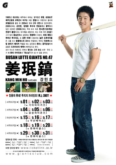 롯데 자이언츠가 5월 경기 일정 포스터를 제작했다. 롯데 구단은 포수 강민호의 캐주얼 의상 컨셉으로 5월 경기일정 포스터 500부를 제작했다. 포스터에는 롯데의 5월 홈경기 일정과 강민호의 프로필과 취미 그리고 입장 요금 안내 등이 실려 있다. 롯데는 이 경기 일정 포스터를 시즌 종료 때까지 매 달 500부씩 발행할 예정이다. 아울러 부산은행 시내 각 지점과 롯데리아, 롯데 시네마, 코리아 세븐 각 매장과 부산시내 각 학료에 배포할 계획이다. 롯데는 지난 4월에도 유격수 박기혁을 모델로 포스터를 제작한 바 있다. sgoi@osen.co.kr 롯데 자이언츠 제공.