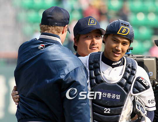 2007 프로야구 두산 베어스와 롯데 자이언츠의 경기가 잠실 야구장에서 벌어져 롯데가 4-0으로 뒤진 9회초 4-3까지 쫓아가며 뒷심을 발휘했지만 두산 마무리 정재훈의 벽에 막혀 1점차의 아쉬운 패배를 당했다. 8이닝을 무실점으로 막고 승리투수가 된 랜들이 경기 후 포수 홍성흔과 마무리 정재훈을 반갑게 맞이하고 있다./잠실=손용호 기자spjj@osen.co.kr