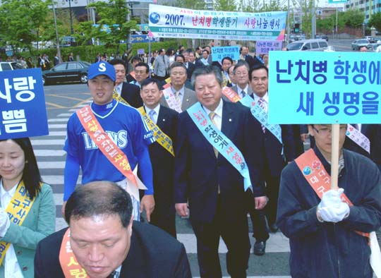 삼성 라이온즈 우완 배영수(26)는 30일 오전 10시 대구학생문화센터 대공연장에서 열리는 '2007 난치병 학생 돕기 사랑나눔 행사'에 참석했다. 대구광역시교육청이 주최하는 난치병 학생돕기 행사는 심장병, 백혈병 등 난치병으로 고통 받고 있는 학생과 가족들에게 꿈과 희망을 주고 더불어 살아가는 사회 실현이라는 목적 아래 2004년부터 시작돼 그 동안 모금 활동을 통해 많은 학생들이 혜택을 받아 왔다. 배영수는 지난 2004년 첫 행사 때부터 홍보대사로 위촉돼, 바자회 참석 및 애장품 기증 등 활발하게 활동 해 왔다. 특히 배영수는 올 시즌 팔꿈치 수술과 재활로 경기에 출전하기 힘든 상황임에도 불구하고 이날 행사에 강한 애착을 갖고 흔쾌히 참가했다. 배영수는 "수술과 재활로 올 시즌은 내게 힘든 시기라고 낙담하기도 했지만 병마와 싸우는 많은 학생들을 보니 더 열심히 재활하고 이들을 위해 다시 마운드에서 잘 해야겠다는 생각이 들었다. 미약하지만 난치병 학생들에게 희망을 주는 존재가 되도록 늘 노력하겠다"고 소감을 밝혔다. what@osen.co.kr 삼성 라이온즈 제공.