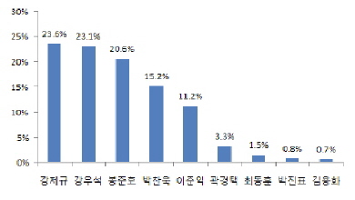 ‘태극기 휘날리며’의 강제규 감독과 ‘실미도’의 강우석 감독이 한국영화의 위기를 타개할 수 있는 감독으로 꼽혔다. 여론조사 전문회사 리얼미터가 최근 전국 19세 이상 남녀 500명을 대상으로 실시한 설문조사에서 강제규 감독과 강우석 감독이 각각 23.6%, 23.1%의 지지를 받았다. 강제규 감독은 지난해 영화 ‘왕의 남자’가 흥행기록을 경신하기 전 최고 흥행작인 ‘태극기 휘날리며’를 연출했고, 강우석 감독은 ‘실미도’로 한국영화 천만 관객 영화시대를 열었다. 또 지난해 한국영화 최고 흥행 기록을 갈아치운 봉준호 감독이 두 감독의 뒤를 이어 3위(20.6%)에 올랐고, 복수시리즈 3부작을 완성한 박찬욱 감독이 4위에 랭크됐다. 또 ‘태극기 휘날리며’의 흥행기록을 경신한 ‘왕의 남자’와 훈훈한 감동을 선사했던 ‘라디오스타’를 연출했던 이준익 감독이 그 뒤를 이었다. pharos@osen.co.kr 여론조사 전문회사 리얼미터가 실시한 ‘최근 한국영화계의 위기를 타개할 감독?’설문조사 결과. /리얼미터 제공.