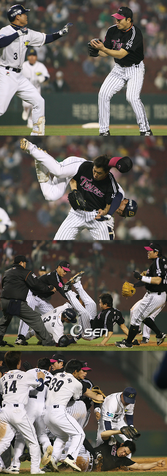 2007 프로야구 서울 라이벌 두산 베어스와 LG 트윈스의 시즌 첫 경기가 4일 잠실 구장에서 벌어졌다. 5회말 1사 1루서 LG 선발투수 봉중근의 볼이 머리 위로 날아가자 흥분한 타자 안경현이 달려가 몸싸움이 벌어졌다. 안경현이 주먹을 날리자 봉중근이 피하며 안경현을 업어친 뒤 넘어지는 안경현이 뒤에서 잡아당겨 봉중근도 넘어지고 있다. 바닥에 깔린 봉중근을 김광수 두산 코치가 보호하고 있다./잠실=손용호 기자spjj@osen.co.kr