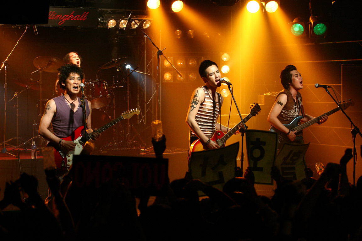 영화 ‘왕의 남자’에서 광기에 찬 연산군을 완벽하게 소화했던 정진영이 기괴한 차림의 펑크밴드로 돌아왔다. 5월 3일 밤 홍대 앞 클럽 롤링 홀에서 열린 ‘즐거운 인생(이준익 감독, 영화사 아침 제작)’ 현장 공개 및 기자 간담회에서 단연 돋보이는 것은 정진영의 변신이었다. 정진영은 이전에 ‘왕의 남자’에서 고뇌에 찬 인간상을 훌륭히 소화했고 최근 ‘날아라 허동구’에서는 부성애 가득한 연기를 펼쳤다. 그런 정진영의 차기작은 ‘왕의 남자’에서의 호흡을 자랑하는 이준익 감독의 새 영화 ‘즐거운 인생’. 정진영은 펑크 스타일의 부풀린 머리에 짙은 눈화장, 문신까지 그려 넣은 파격적인 모습이었다. ‘즐거운 인생’은 정진영 외에 ‘타짜’의 김윤석, ‘마파도’의 김상호, 드라마 ‘황진이’의 장근석이 함께 하는 '철없는 네 남자의 유쾌한 록밴드 이야기'로, 이준익 감독은 “잃어버린 꿈을 찾아가는 사람들의 이야기”라고 소개했다. 이날 촬영 내용은 20년 만에 다시 뭉친 록밴드 ‘활화산’이 홍대 앞 클럽에서 ‘불놀이야’를 연주하는 공연장면으로 영화의 하이라이트에 해당한다. 어색한 폼과 엉성한 연주 때문에 병이 날아올까 두려웠던 첫 공연과는 반대로, 관객들의 뜨거운 호응을 받은 활화산이 자신감을 얻고 파격 변신을 펼치는 부분이다. ‘즐거운 인생’은 올추석께 만나볼 수 있다. 9pd@osen.co.kr
