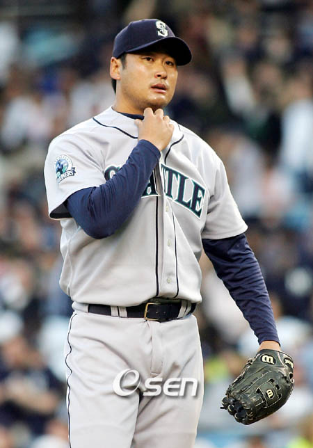 5일(한국시간) 뉴욕의 양키스타디움서 벌어진 뉴욕 양키스와 시애틀 매리너스의 경기에 선발 등판한 시애틀의 백차승이 0-1이던 1회말 1사 만루에서 내야진이 전진 수비를 펼치다 호르헤 포사다에게 약하게 굴러가는 우전 안타를 맞고 2점을 내준 뒤 긴장한 표정으로 유니폼을 매만지고 있다. 백차승은 3⅔이닝 8피안타 7실점을 기록했으나 타선의 도움으로 패전을 면했다. /양키스타디움(뉴욕)=주지영 특파원 jj0@osen.co.kr