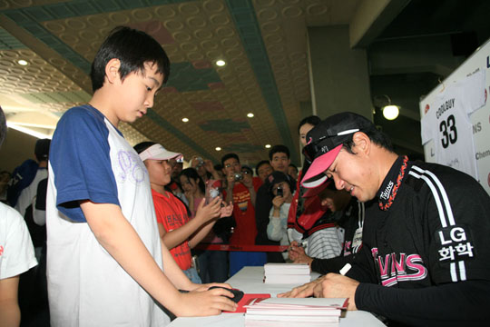 어린이날을 맞아 LG 트윈스의 좌완 투수 봉중근과 좌타 강타자 박용택이 5일 잠실구장서 팬사인회를 가졌다. 봉중근과 박용택은 경기에 앞서 오후 1시부터 1시반까지 약 30분 동안 3루측 복도에 위치한 LG 트윈스존에서 어린이날을 맞아 야구장을 찾은 어린이 팬들에게 사인을 해주는 시간을 가졌다. 이날 행사에는 30분동안 수 백 명의 어린이들이 참가해 성황을 이뤘다. /LG 트윈스 제공.